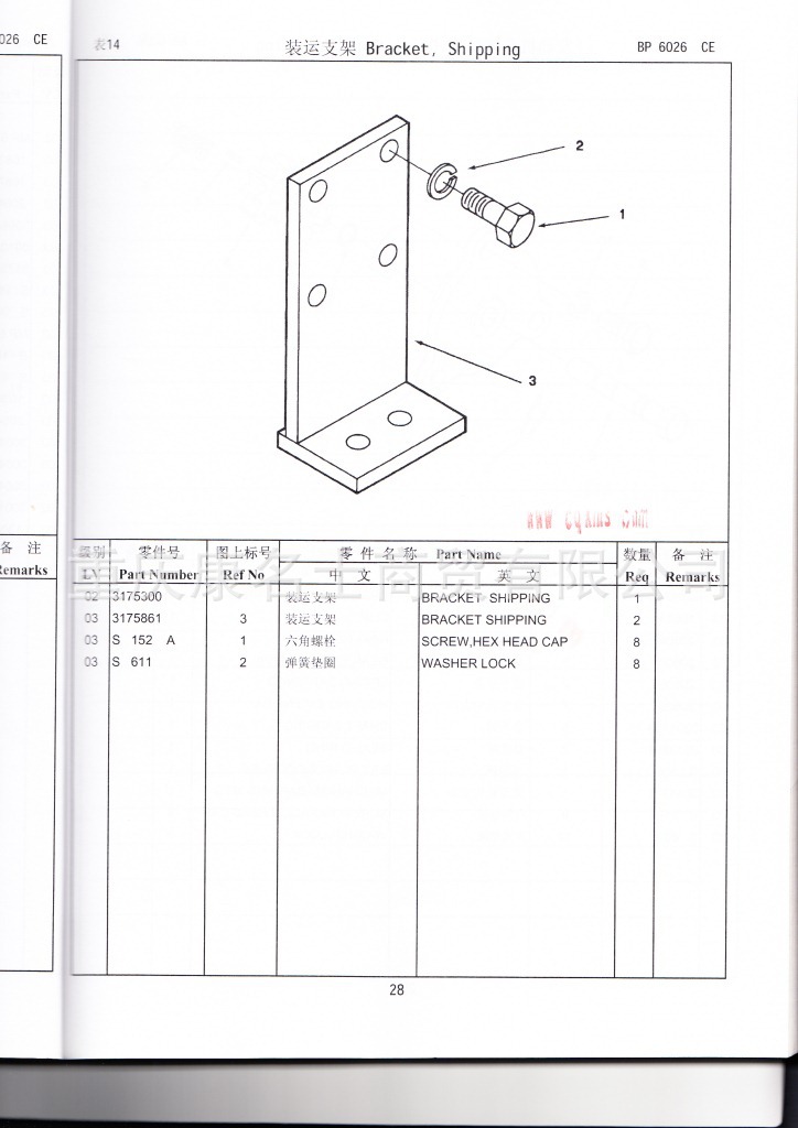 KTA38-C1200装运支架 915-027-026康明斯KTA38-C1200零件图册4915128第028页装运支架图表 零件图册的编号:915-027 零件图册的零件号:4915128 零件图册的发动机机型:KTA38-C1200 零件图册的页码:第028页 这一页的主要内容:装运支架 请您仔细对照安装图和表,找到你需要的配件的安装位置与安装图中的的编号,并且从表中确认对应的零件号和零件名称。再一次提醒您,随着技术的进步和零件号的替换,你需要的配件的零件号可能与图表中的零件号并不完全相同,我们只能给你介绍当前主机厂装机的对应的正确的零件号,请你与在线的销售人员反复核对实物图片的形状和相关技术尺寸,避免买到用不上的配件。
