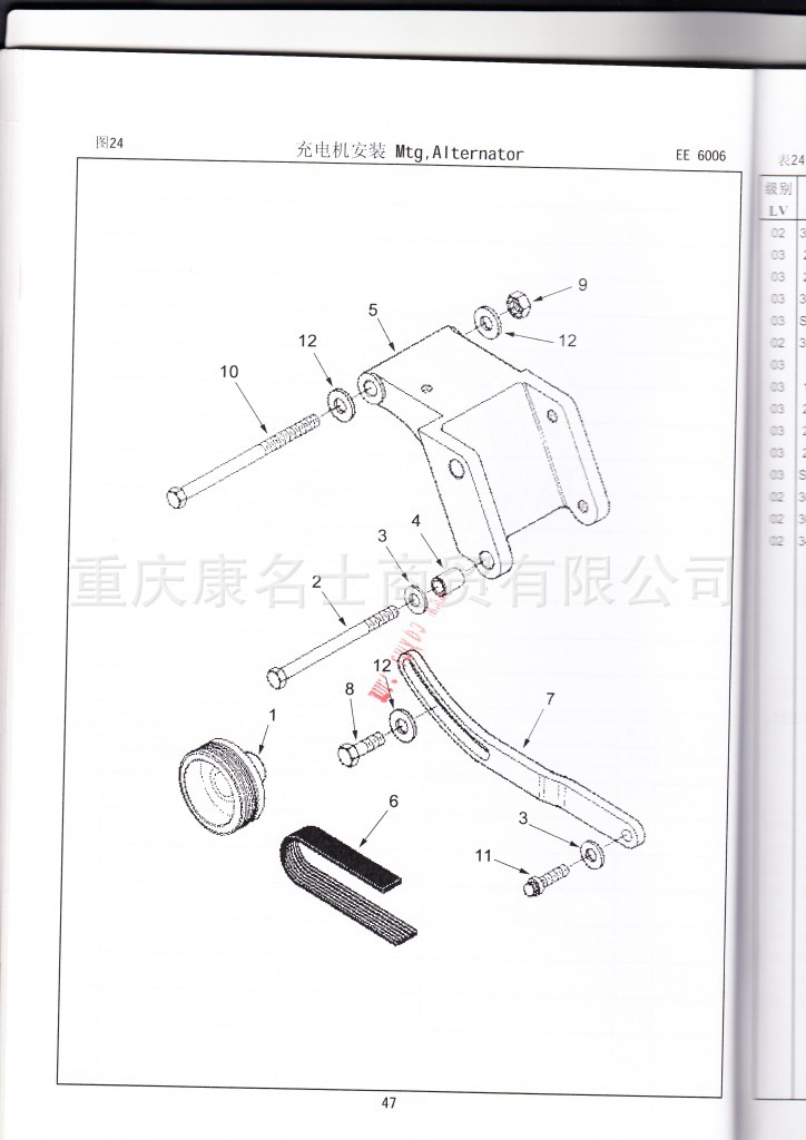 KTA38-C1200充电机安装 915-027-042康明斯KTA38-C1200零件图册4915128第047页充电机安装图 零件图册的编号:915-027 零件图册的零件号:4915128 零件图册的发动机机型:KTA38-C1200 零件图册的页码:第047页 这一页的主要内容:充电机安装 请您仔细对照安装图和表,找到你需要的配件的安装位置与安装图中的的编号,并且从表中确认对应的零件号和零件名称。再一次提醒您,随着技术的进步和零件号的替换,你需要的配件的零件号可能与图表中的零件号并不完全相同,我们只能给你介绍当前主机厂装机的对应的正确的零件号,请你与在线的销售人员反复核对实物图片的形状和相关技术尺寸,避免买到用不上的配件。