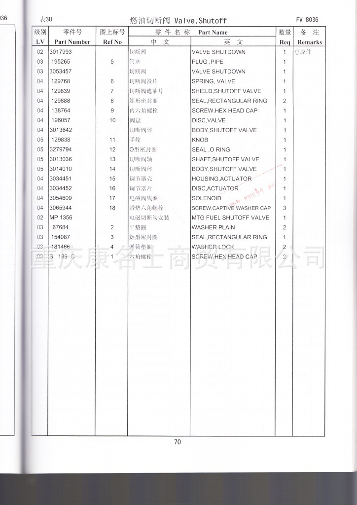 KTA38-C1200燃油切断阀 915-027-063康明斯KTA38-C1200零件图册4915128第070页燃油切断阀表 零件图册的编号:915-027 零件图册的零件号:4915128 零件图册的发动机机型:KTA38-C1200 零件图册的页码:第070页 这一页的主要内容:燃油切断阀 请您仔细对照安装图和表,找到你需要的配件的安装位置与安装图中的的编号,并且从表中确认对应的零件号和零件名称。再一次提醒您,随着技术的进步和零件号的替换,你需要的配件的零件号可能与图表中的零件号并不完全相同,我们只能给你介绍当前主机厂装机的对应的正确的零件号,请你与在线的销售人员反复核对实物图片的形状和相关技术尺寸,避免买到用不上的配件。