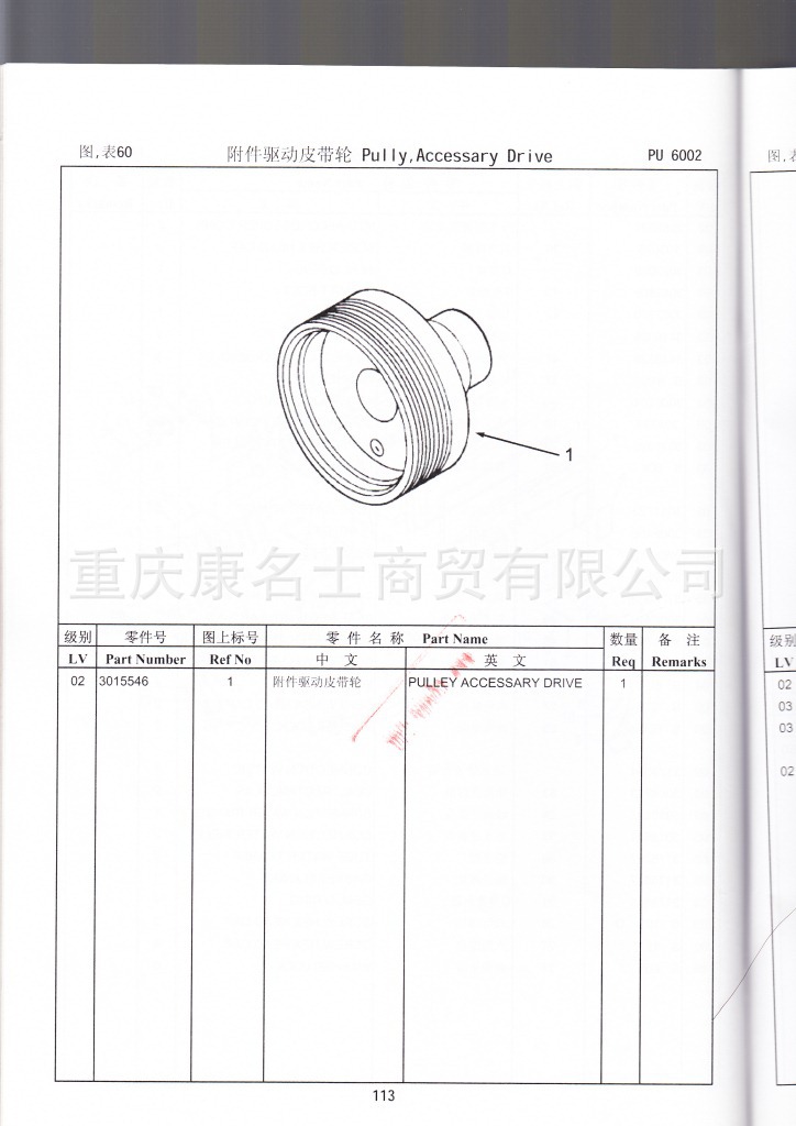 KTA38-C1200附件驱动皮带轮 915-027-102康明斯KTA38-C1200零件图册4915128第113页附件驱动皮带轮图表 零件图册的编号:915-027 零件图册的零件号:4915128 零件图册的发动机机型:KTA38-C1200 零件图册的页码:第113页 这一页的主要内容:附件驱动皮带轮 请您仔细对照安装图和表,找到你需要的配件的安装位置与安装图中的的编号,并且从表中确认对应的零件号和零件名称。再一次提醒您,随着技术的进步和零件号的替换,你需要的配件的零件号可能与图表中的零件号并不完全相同,我们只能给你介绍当前主机厂装机的对应的正确的零件号,请你与在线的销售人员反复核对实物图片的形状和相关技术尺寸,避免买到用不上的配件。