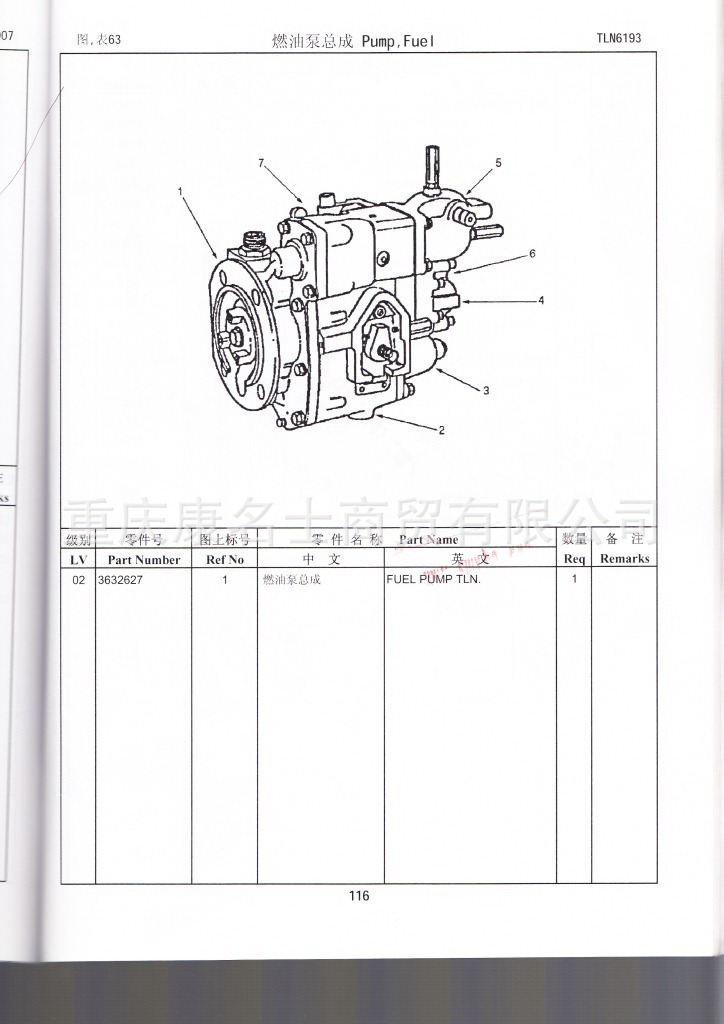 KTA38-C1200燃油泵总成 915-027-105康明斯KTA38-C1200零件图册4915128第116页燃油泵总成图表 零件图册的编号:915-027 零件图册的零件号:4915128 零件图册的发动机机型:KTA38-C1200 零件图册的页码:第116页 这一页的主要内容:燃油泵总成 请您仔细对照安装图和表,找到你需要的配件的安装位置与安装图中的的编号,并且从表中确认对应的零件号和零件名称。再一次提醒您,随着技术的进步和零件号的替换,你需要的配件的零件号可能与图表中的零件号并不完全相同,我们只能给你介绍当前主机厂装机的对应的正确的零件号,请你与在线的销售人员反复核对实物图片的形状和相关技术尺寸,避免买到用不上的配件。