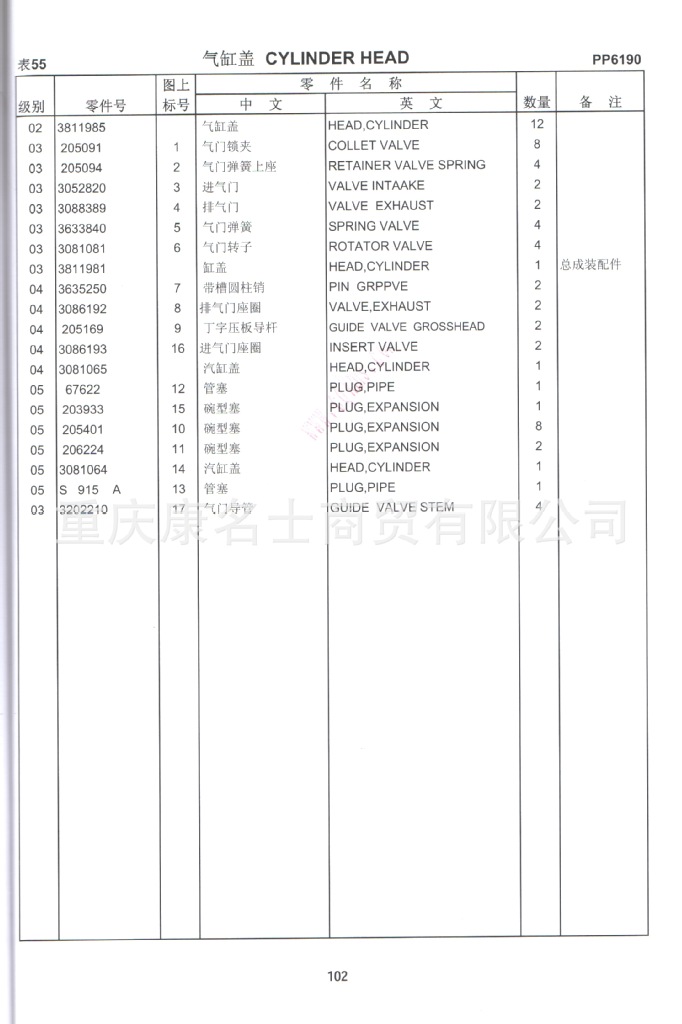 - 915-031-093康明斯KTA38-G5零件图册4915099第102页气缸盖表