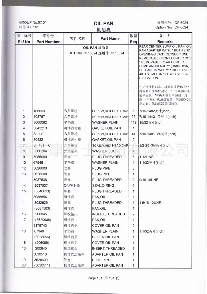 - 915-350-128康明斯KTA50-G3/G8/G9零件目录4915314第131页机油盘
