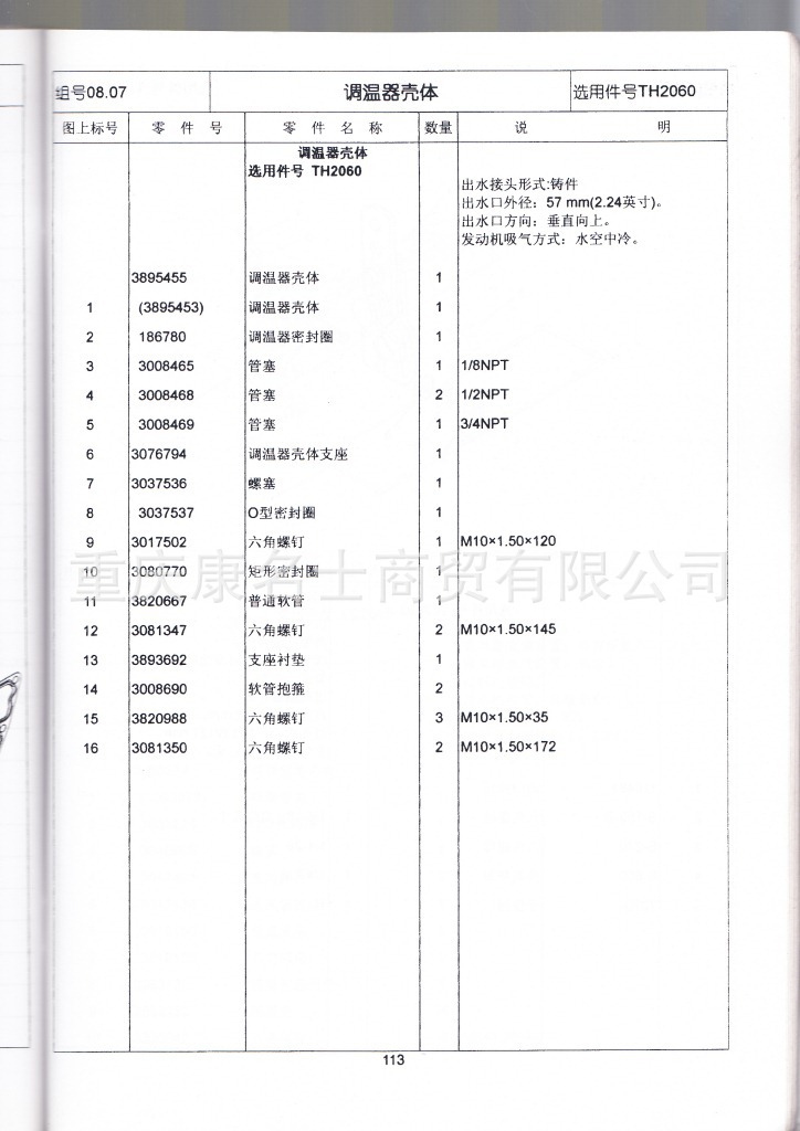 915-046-107康明斯M11零件目录3672081第113页调温器壳体表